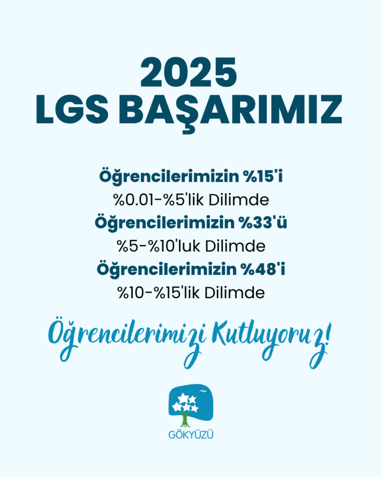 2025 LGS sonuçlarına göre öğrencilerimizin; %15’i %0.01-%5’lik dilimde, %33’ü %5-%10’luk dilimde, %48’i %10-%15’lik dilimde yer alarak bizleri gururlandırdılar. Öğrencilerimizi tebrik ediyor, başarılarının devamını