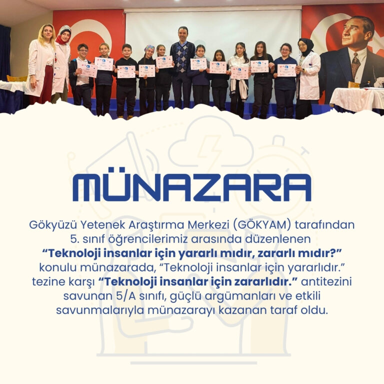 Gökyüzü Yetenek Araştırma Merkezi (GÖKYAM) tarafından 5. sınıf öğrencilerimiz arasında düzenlenen “Teknoloji insanlar için yararlı mıdır, zararlı mıdır?” konulu münazarada,