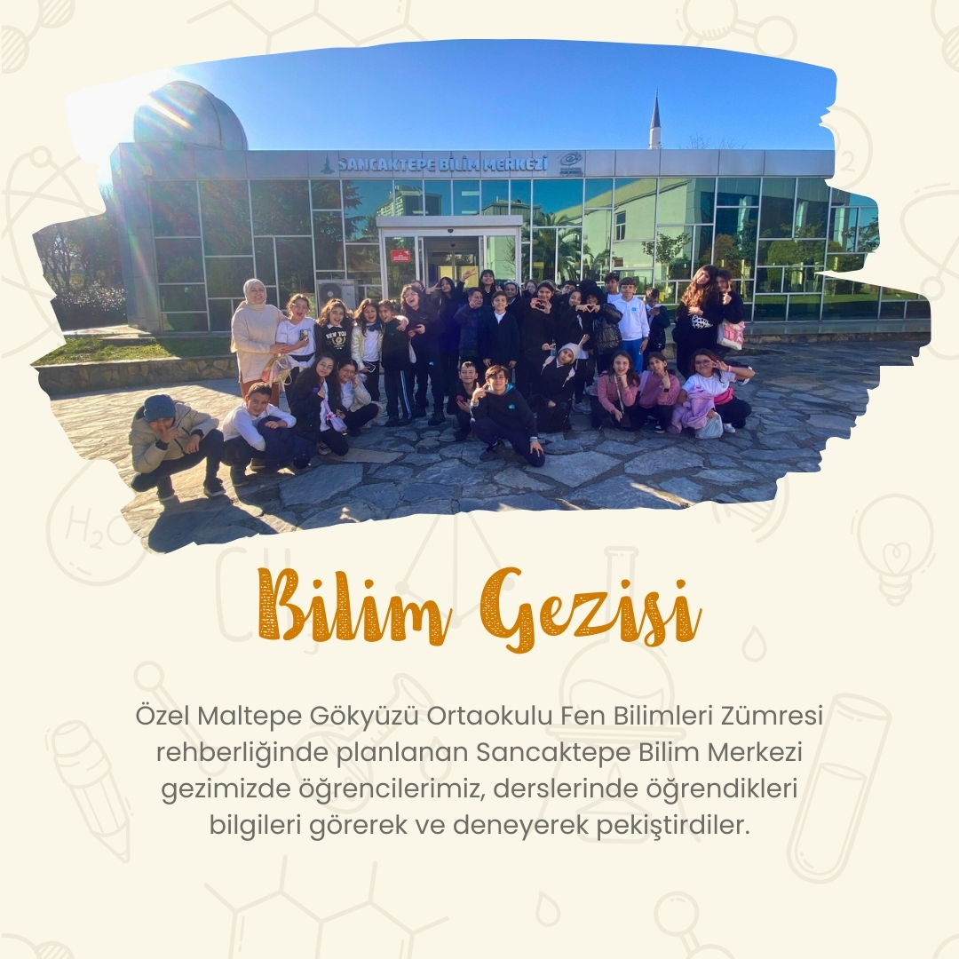 Özel Maltepe Gökyüzü Ortaokulu Fen Bilimleri Zümresi rehberliğinde planlanan gezide derste öğrendiğimiz bilgileri somutlaştırabilmek adına 5. sınıf öğrencileri ile birlikte Sancaktepe’de bulunan Sancaktepe Bilim Merkezini ziyaret ettik.